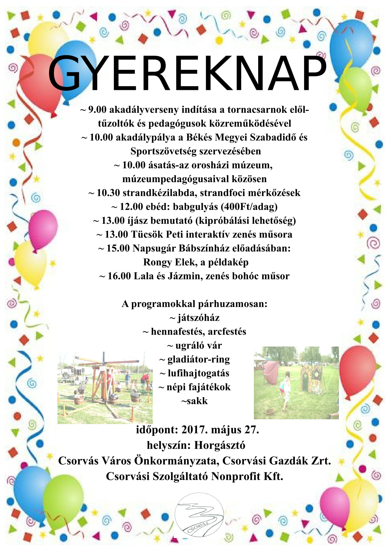 2017. május 27-én GYEMEKNAP-i rendezvény a csorvási horgásztónál, plakátja IDE KATTINTVA megtekinthető.
